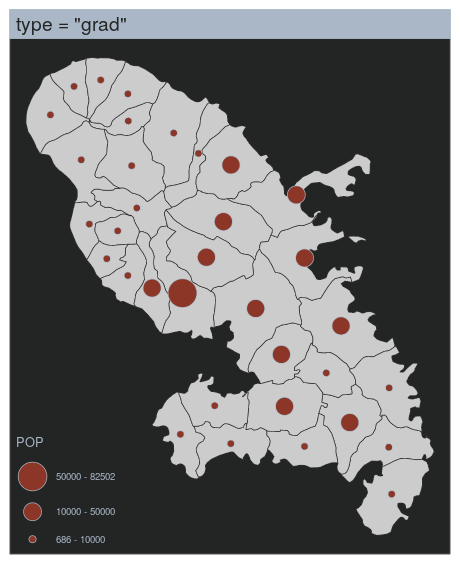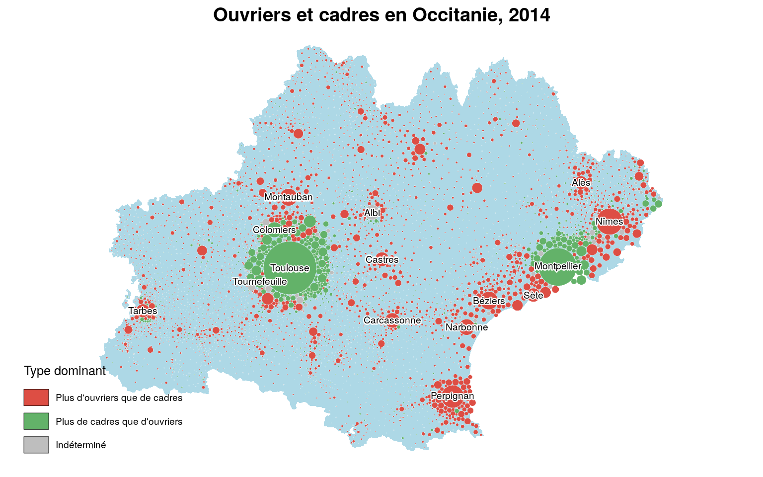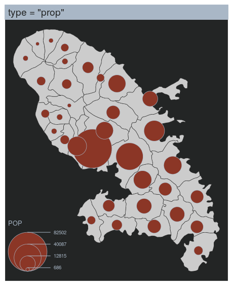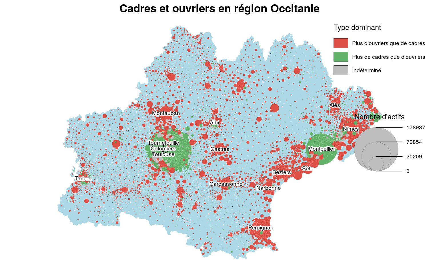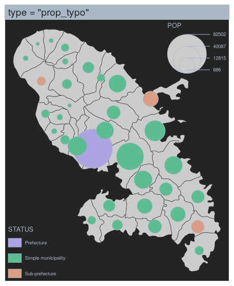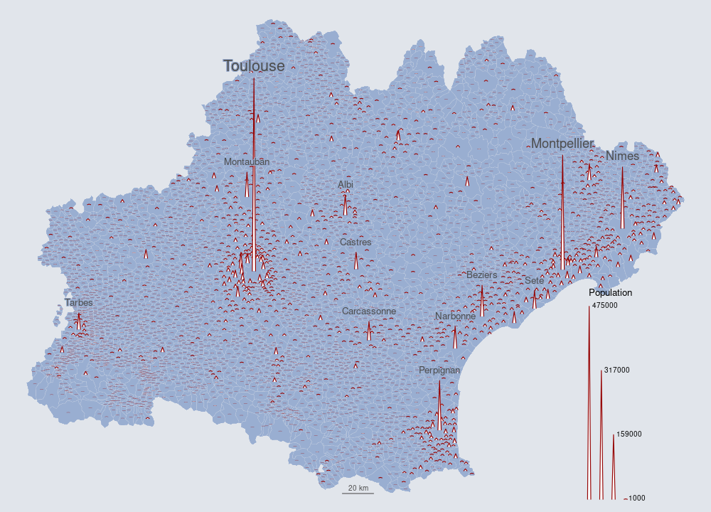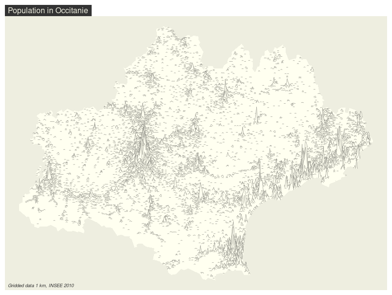 library(sf)library(spikemap)library(mapsf)# import the dataset from the packagecom <-st_read(system.file("gpkg/com.gpkg", package="spikemap"))# theme mf_theme(mar =c(0,0,0,0), bg ="#e1e5eb", fg ="grey30")# save figure as spiky.png in img foldermf_export(x = com, filename ="img/spiky.png", width =1000, res =100)# plot the base mapmf_map(com, col="#99aed1", border ="#e1e5eb", lwd =0.2, add = T)# display spikes for municipalities under 1000 inhabitants.# use fixmax arg to allow multiple spike plots with the same scale.spikemap(x = com[com$pop<=1000, ], var ="pop",inches =2.3, fixmax =500000,col ="#ffffff90", border ="#94000090", lwd = .5,legend.pos ="x")# display spikes for other municipalities# use locator() to pick a place for the legend or use "bottomleft".spikemap(x = com[com$pop>1000, ], var ="pop",inches =2.3, fixmax =500000,col ="#ffffff", border ="#940000", lwd =1.1,legend.pos =c(799307.2, 6128000),legend.title.txt ="Population",legend.values.rnd =-3)# get the tips of the spikeslbl <-spikelabel(x = com, var ="pop",inches =2.3, fixmax =500000)lbl <- lbl[order(lbl$pop, decreasing = T),]# display only the 12 first, use various cex and halomf_label(lbl[1:12,], var ="name",pos =3, offset = .5,halo = T, bg ="#99aed150",cex =c(1.3, 1.1, 1, rep(.8,12)),col ="grey30")# add scale bar, north arrow, title, sources...mf_scale(size =20, pos=c(629638.7 ,6136862.3 ), lwd =1)mf_arrow(pos ="topright", col ="grey60")mf_credits(paste0("ADMIN EXPRESS COG édition 2019, IGN\n","T. Giraud, 2020 | spikemap 0.1.0"))mf_title(txt ="Population \nin Occitanie", inner = T, line =8, cex =2.5, font =3, fg ="grey30", bg =NA)dev.off()