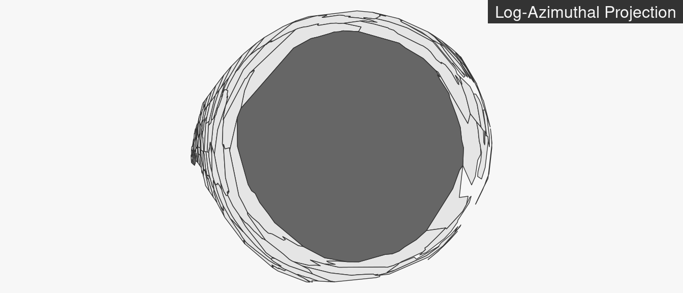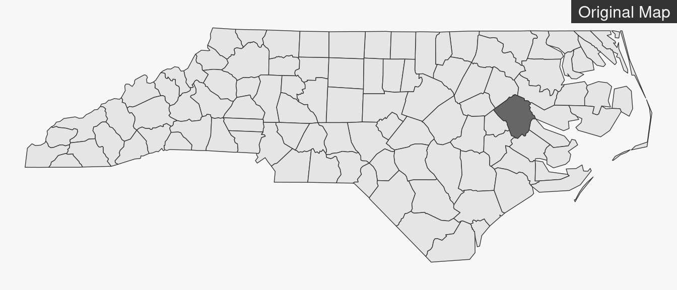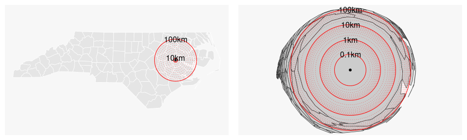 library(fisheye)library(mapsf)# Import datasetncraw <-st_read(system.file("shape/nc.shp", package="sf"), quiet =TRUE)nc <-st_transform(ncraw, 3857)mf_map(nc, col ="grey90")mf_map(nc[51, ], add =TRUE, col ="grey40")mf_title("Original Map")# transform the basemapnc_fe <-fisheye(nc, centre = nc[51, ])mf_map(nc_fe, col ="grey90")mf_map(nc_fe[51, ], add =TRUE, col ="grey40")mf_title("Log-Azimuthal Projection")
