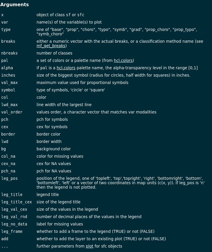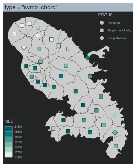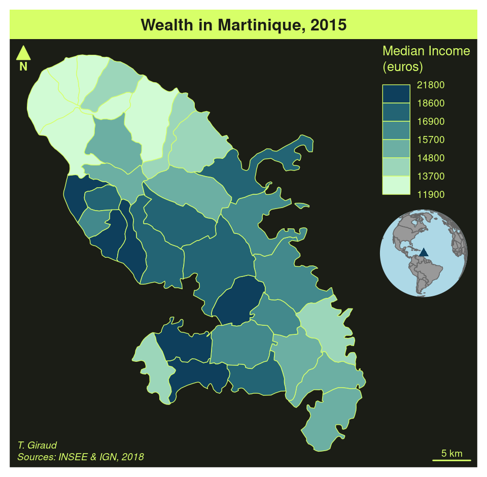 mtq <-mf_get_mtq()# Set a theme mf_theme(x ="green")# Plot a choropleth mapmf_map(x = mtq, var ="MED", type ="choro",pal ="Dark Mint",breaks ="quantile",nbreaks =6,leg_title ="Median Income\n(euros)",leg_val_rnd =-2,leg_pos ="topright")# Add an inset world mapmf_inset_on(x ="worldmap", pos ="right")mf_worldmap(mtq, col ="#0E3F5C")mf_inset_off()# Plot a layout elementsmf_title("Wealth in Martinique, 2015")mf_credits("T. Giraud\nSources: INSEE & IGN, 2018")mf_scale(size =5)mf_arrow('topleft')