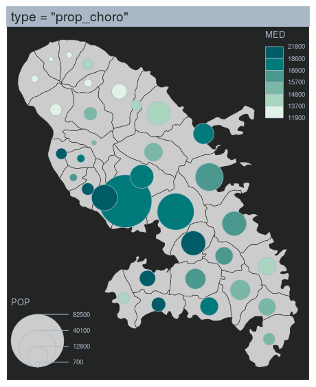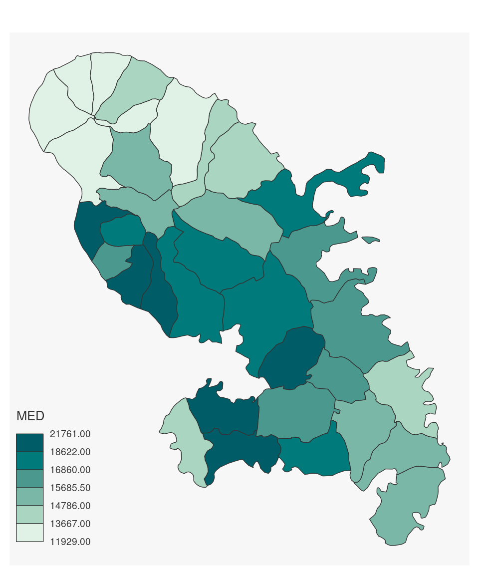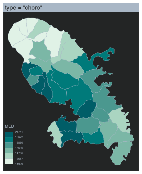 mtq <-mf_get_mtq()# Plot a choropleth mapmf_map(x = mtq, var ="MED", type ="choro")
