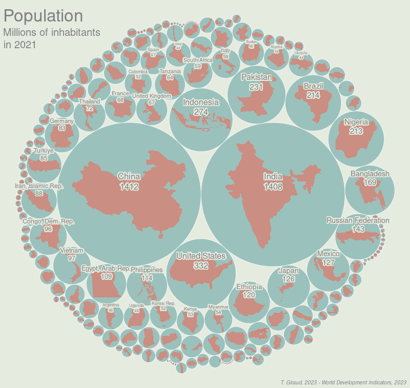 library(rnaturalearth)library(sf)library(wbstats)library(popcircle)library(mapsf)# Get countriesctry <-ne_countries(scale =50, returnclass ="sf")ctry <-st_transform(ctry, "ESRI:54030")# Only keep the largest polygons of multipart polygons for a few countries# (e.g. display only continental US)frag_ctry <-c("US", "RU", "FR", "IN", "ES", "NL", "CL", "NZ", "ZA")largest_ring =function(x) { x$ids <-1:nrow(x) pols =st_cast(x, "POLYGON", warn =FALSE) spl =split(x = pols, f = pols$ids)do.call(rbind, (lapply(spl, function(y) y[which.max(st_area(y)), ])))}st_geometry(ctry[ctry$iso_a2 %in% frag_ctry, ]) <-st_geometry(largest_ring(ctry[ctry$iso_a2 %in% frag_ctry, ]))# Get and merge datadata_pop <-wb_data(indicator ="SP.POP.TOTL",start_date =2021,end_date =2021)ctry_pop <-merge(ctry[, "iso_a2"], data_pop, by.x ="iso_a2", by.y ="iso2c")# Computes circles and polygonsres_pop <-popcircle(x = ctry_pop, var ="SP.POP.TOTL")circles_pop <- res_pop$circlesshapes_pop <- res_pop$shapes# Create the figuremf_theme(mar =c(0, 0, 0, 0),bg ="#e6ebe0",fg ="grey50")mf_export(x = circles_pop,filename ="pop.png",width =800,res =100)# display circles and polygonsmf_map( circles_pop,col ="#9bc1bc",border ="white",add = T)mf_map( shapes_pop,col ="#ed6a5a95",border ="#ed6a5a",add =TRUE,lwd = .3)# labelscircles_pop$lab <-paste0(circles_pop$country,'\n',round(circles_pop$SP.POP.TOTL /1000000))mf_label(x = circles_pop[1:36, ],var ="lab",halo =TRUE,overlap = T,pos =3,cex =seq(1, 0.4, length.out =36),r = .15)# titlemtext("Population",side =3,adj =0.01,padj =-1.5,col ="grey50",cex =2)mtext("Millions of inhabitants\nin 2021",side =3,adj =0.01,padj =0.4,col ="grey50",cex =1.2)# cerditsmf_credits(txt ="T. Giraud, 2023 - World Development Indicators, 2023",pos ="bottomright")dev.off()