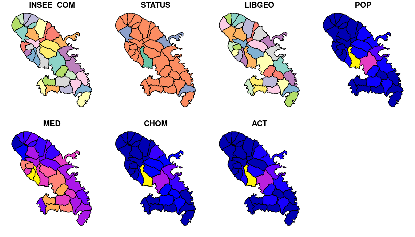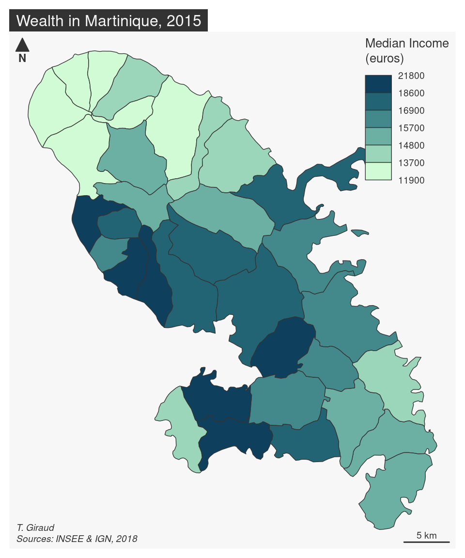 mtq <-mf_get_mtq()# Plot a choropleth mapmf_map(x = mtq, var ="MED", type ="choro",pal ="Dark Mint",breaks ="quantile",nbreaks =6,leg_title ="Median Income\n(euros)",leg_val_rnd =-2,leg_pos ="topright")# Plot a layout elementsmf_title("Wealth in Martinique, 2015")mf_credits("T. Giraud\nSources: INSEE & IGN, 2018")mf_scale(size =5)mf_arrow('topleft')