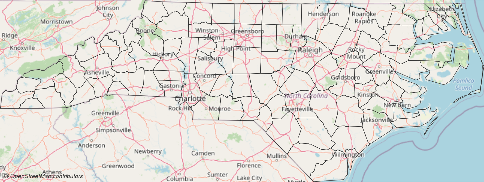 library(sf)library(maptiles)# import North Carolina countiesnc_raw <-st_read(system.file("shape/nc.shp", package="sf"), quiet =TRUE)# Project to EPSG:3857nc <-st_transform(nc_raw, "EPSG:3857")# dowload tiles and compose raster (SpatRaster)nc_osm <-get_tiles(nc, crop =TRUE)# display mapmf_theme(mar =c(0,0,0,0))mf_raster(nc_osm)mf_map(nc, col =NA, add =TRUE)# add creditmf_credits(txt =get_credit("OpenStreetMap"))